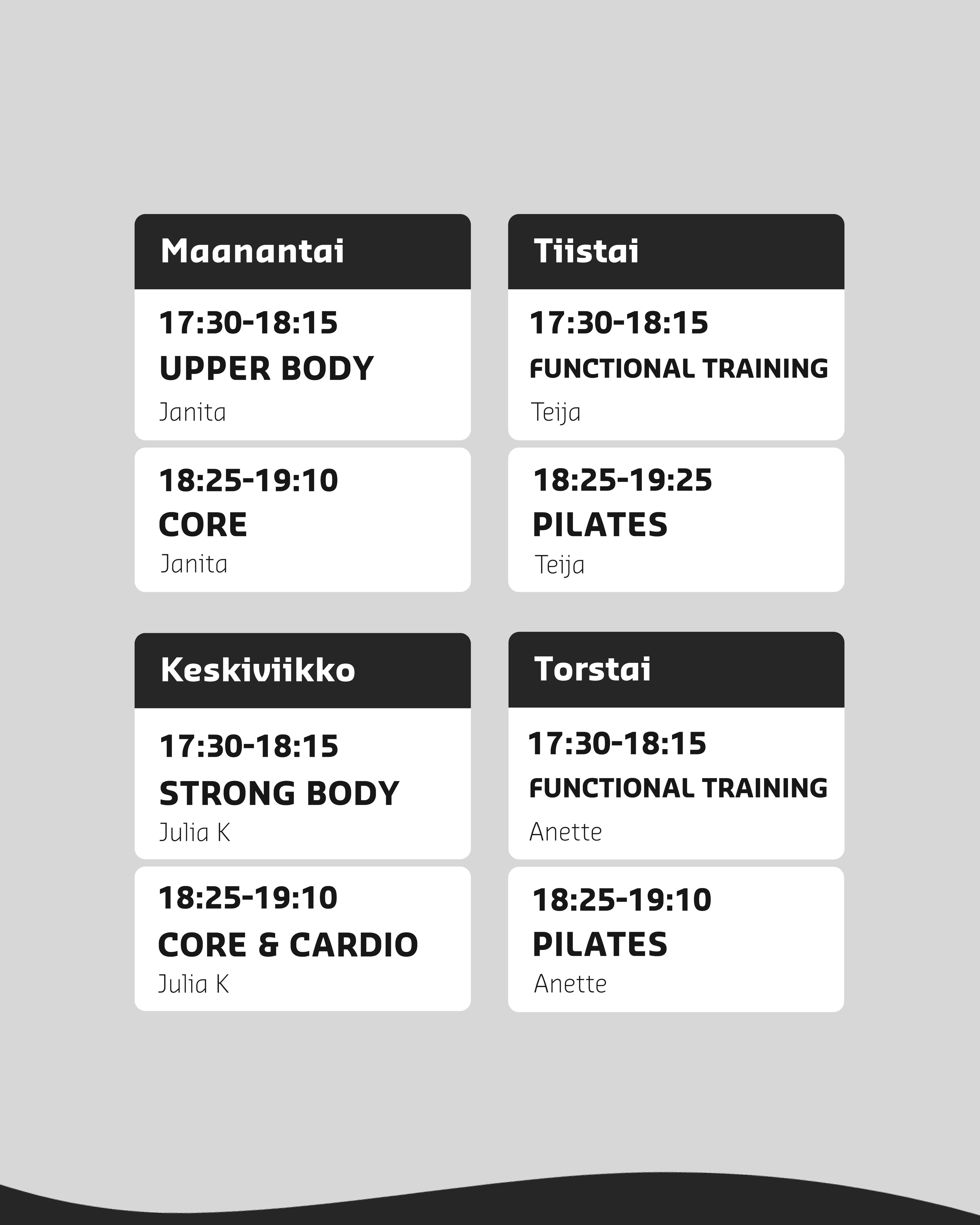 Ohjatut tuntimme tarjoaa laajan valikoiman tunteja, joissa keskitytään eri hyvinvoinnin osa-alueisiin – olipa kyseessä sitten kestävyyskunto, lihasvoima, liikkuvuus tai mielen ja kehon rentoutus. Valikoimastamme tulee löytyy jokaiselle jotakin, olitpa sitten kokenut liikkuja tai vasta aloitteleva kuntoilija. Tunneillemme voi hypätä mukaan milloin vain, ei siis haittaa, jos et pääse osallistumaan tunneille heti kauden alusta alkaen, tai joka viikko. Valikoimassamme tulee olemaan mm. lihaskuntotunteja, pilatesta, joogaa, kehonhuoltoa, tanssia (latinissimo), HIIT ja senioritunteja yms..